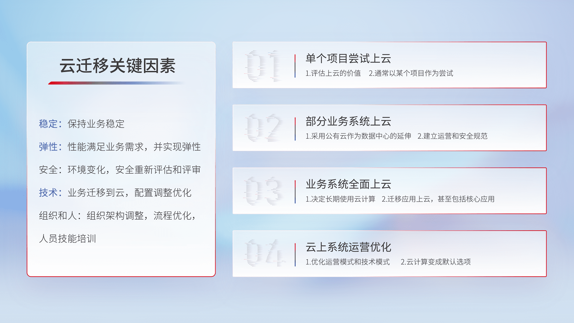 结合实际业务,,,从规划设计、、云平台选型、、、、云原生改造、、数据迁移、、集成交付,,,迁移全过程为客户识别最佳上云路径,,,,做好风险识别管理,,,,设计网络架构、、身份权限、、安全审计合规、、、操作审计、、日志审计、、、、监控告警策略、、多站点容灾设计等,,对云上基础设施进行整体规划,,,,提升IT治理水平,,以满足弹性、、高可用、、、、高性能的需求。。。