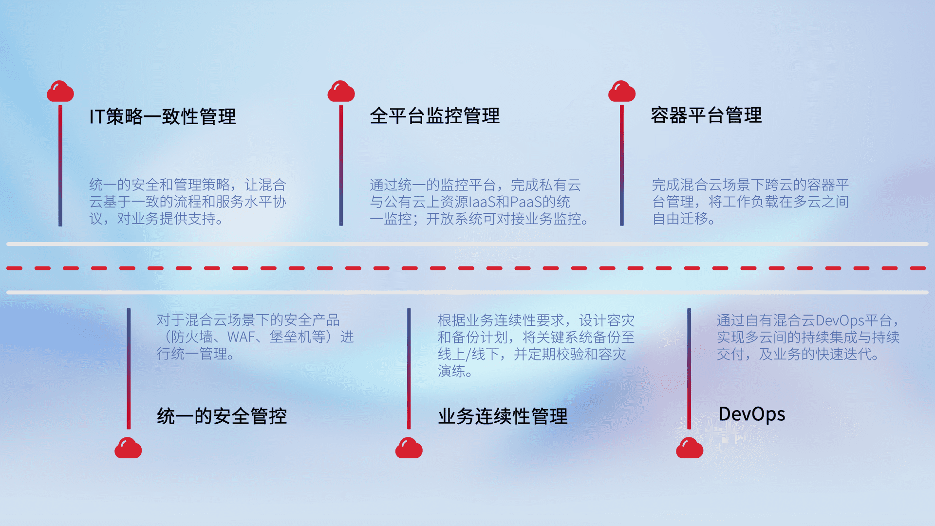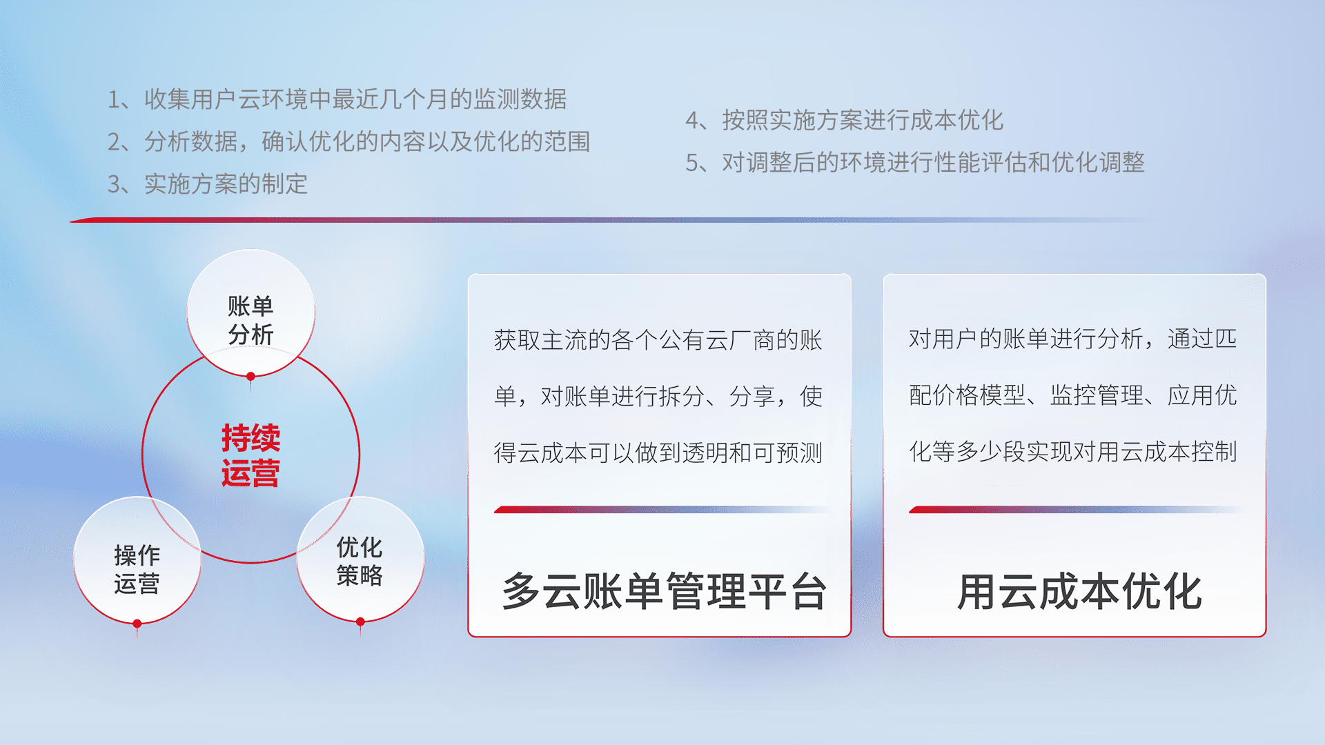 通过多云纳管,,以统一的资源数据模型把客户的云资源进行抽象和封装,,进而实现对多云资源的统一操作,,,,保障云资源管理的可靠性、、、稳定性与可用性。。。量身定制化运维内容,,配置、、、、开发运维、、补丁管理、、、、备份、、、监控、、、、认证和访问管理、、、审计和日常巡检等,,保障在用云过程中的可靠度,,,,稳定度以及高可用率。。